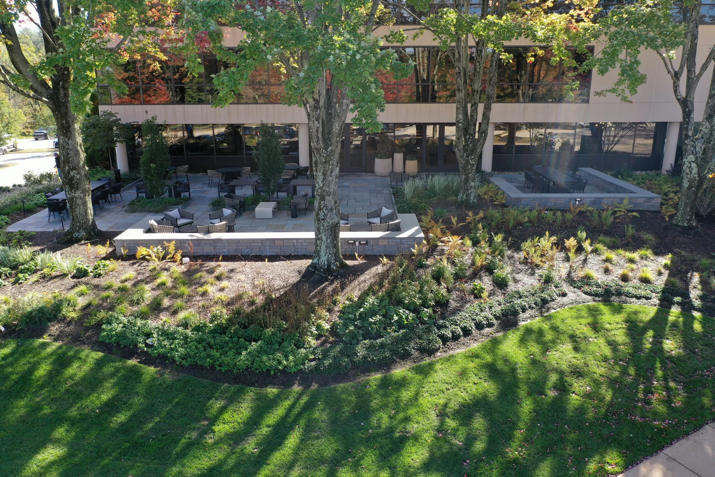 The Stuart team had the opportunity to design an exterior amenity space that offers a flexible and functional environment that seamlessly integrates the beauty and comfort of working outdoors. Developed by our team of landscape architects in partnership with D2 Architects & interiors, the newly renovated spaces for our client Essent Guaranty Inc. are designed to enhance relaxation, collaboration, and productivity. Stuart was commissioned to convert the underutilized lawn space secluded beneath mature ‘Armstrong’ Maple trees into an exterior working oasis. The final design result is a coworking space surrounded by a vivacious shade garden which offers employees and visitors a refreshing alternative to traditional indoor office settings. The private patio features two conference tables, numerous outdoor power connection options, and comfortable lounge and dining seating arrangements encompassed by seat walls. Thoughtfully integrated into the park’s landscape, the amenity space creates a harmonious balance between nature and modern business needs. Whether for virtual or in-person meetings, outdoor lunches, or individual focus time, the Essent amenity patio in Radnor Corporate Park redefines the work experience.
