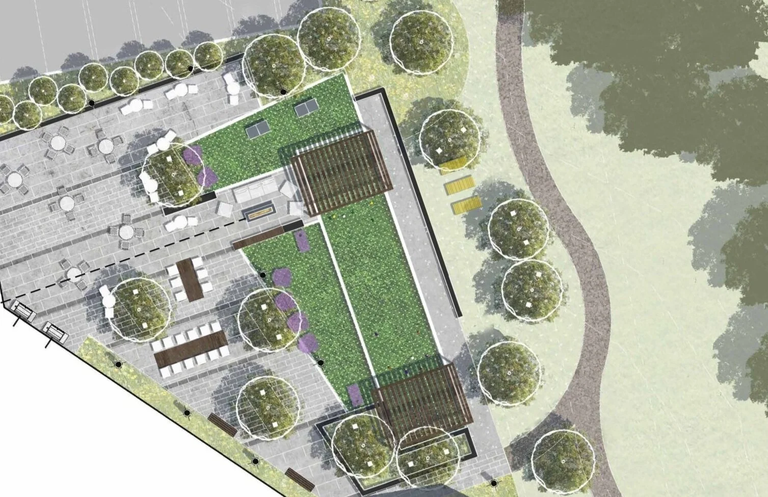 The Stuart team was engaged to provide an outdoor amenity space for the INSMED workplace. Through sun shade studies, inventory and analysis, density studies, and collaborative meetings; the design team was able to create an outdoor space for the employees to use all year round. In order to provide more space for activity and events, the patio was turned towards the east to run parallel to the building. This allowed for more usable space and helped mitigate some grading constraints.
